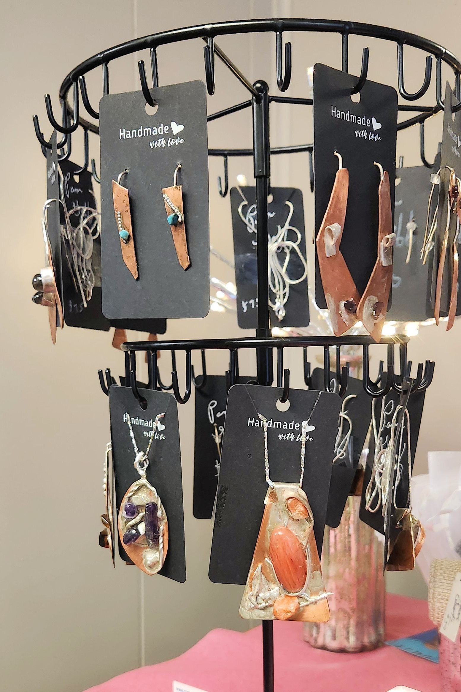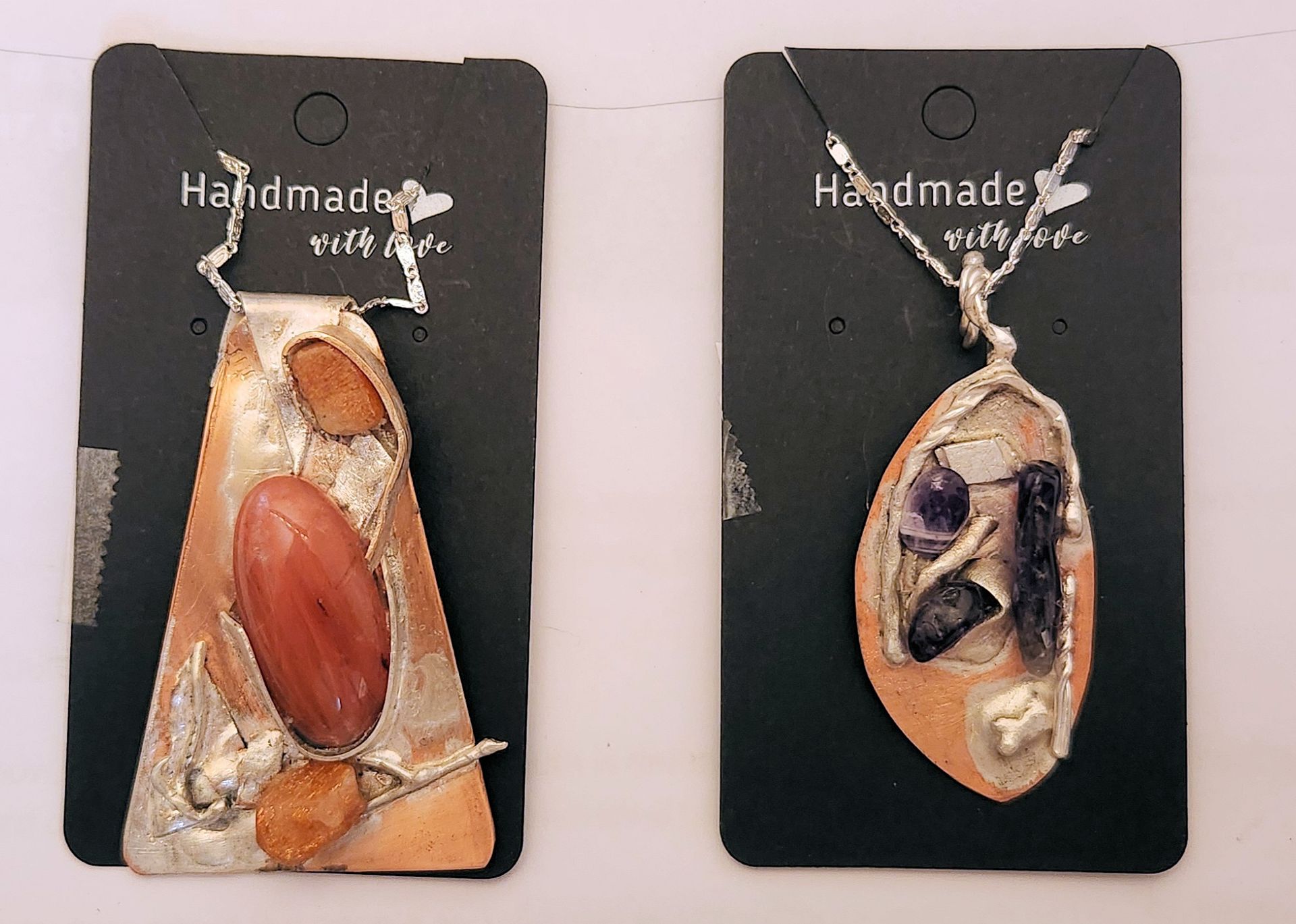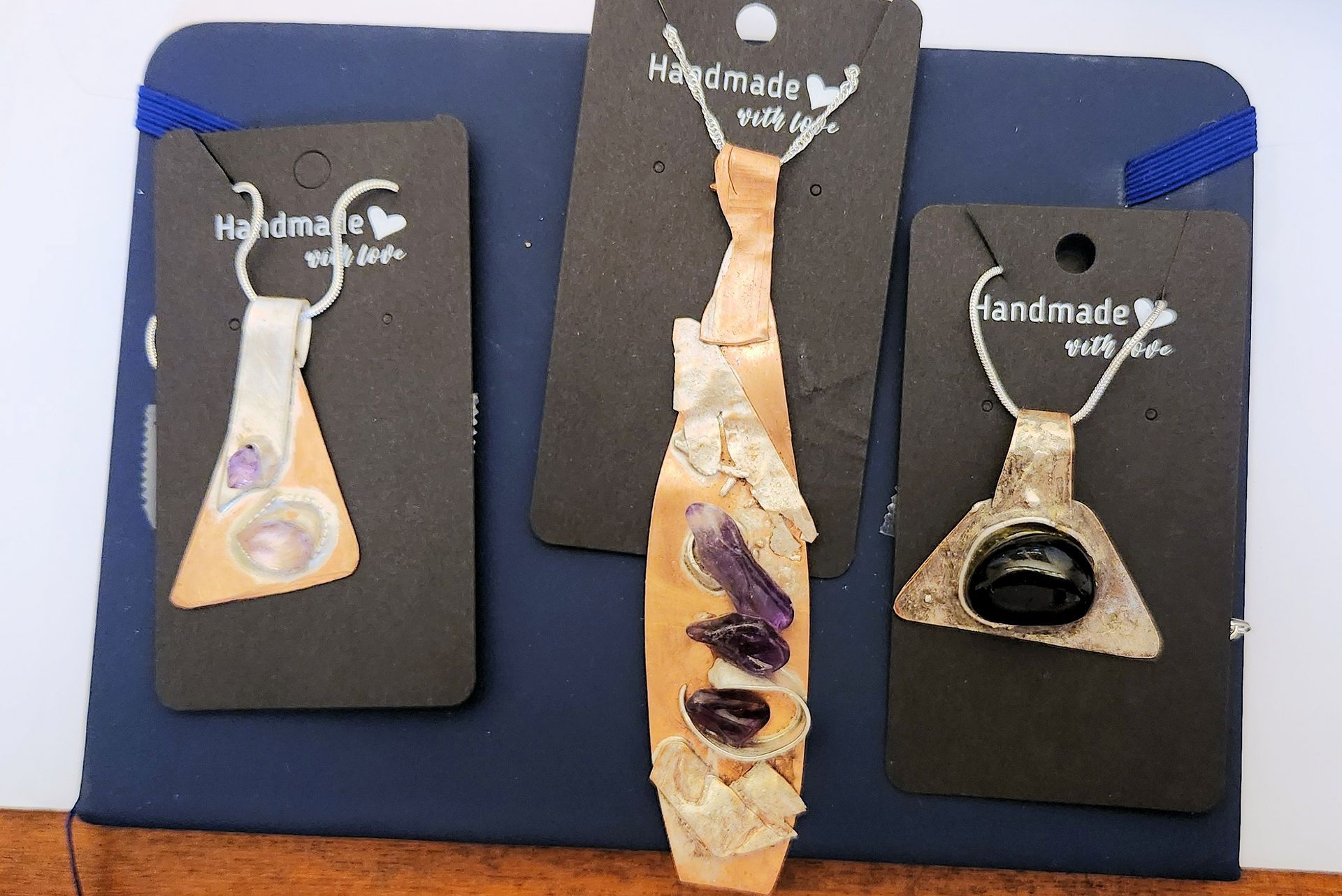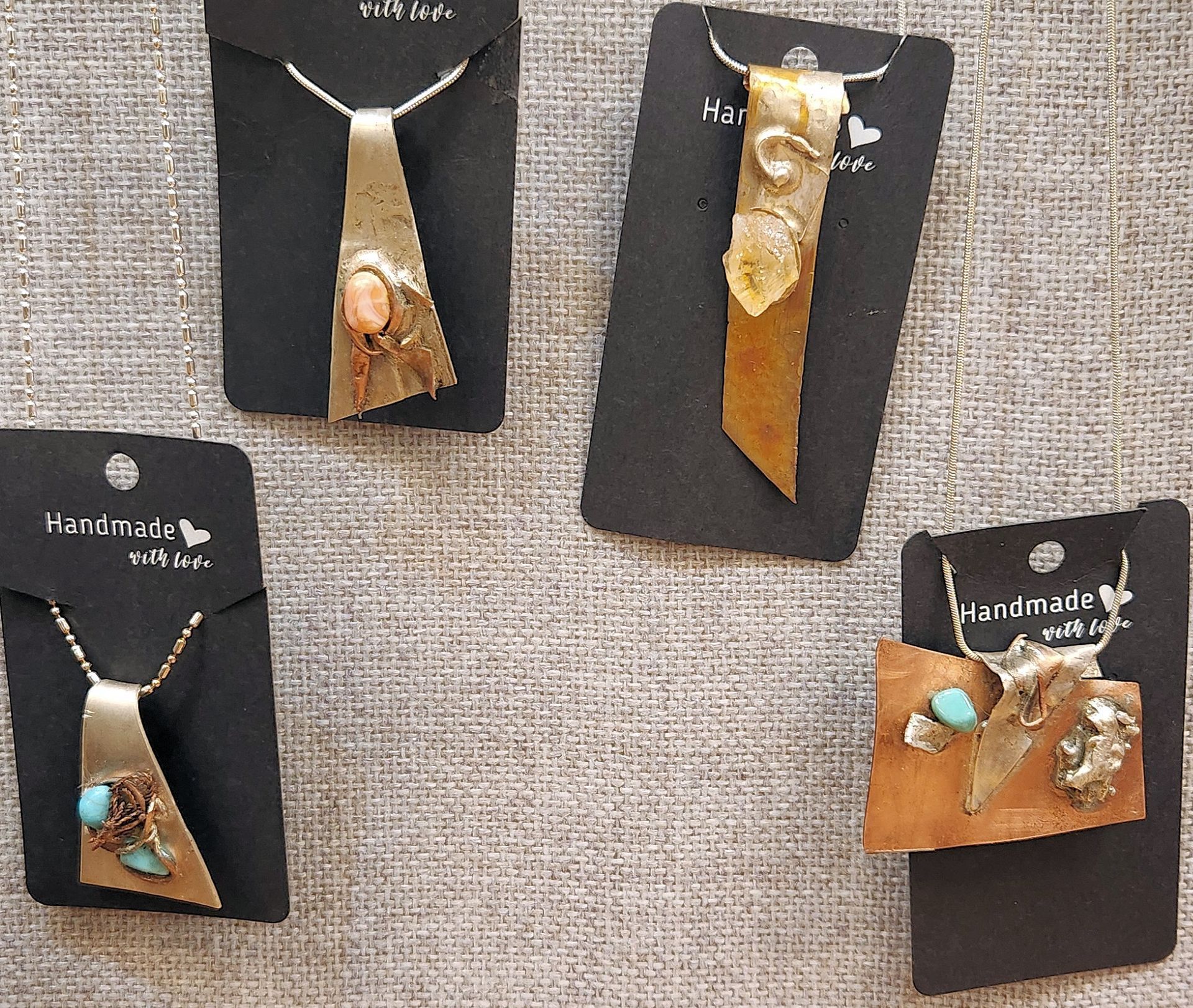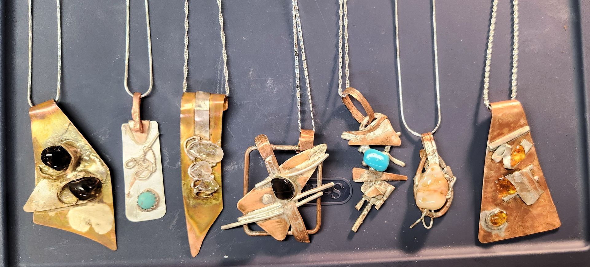 These are copper, sterling silver, and gemstone pendants.